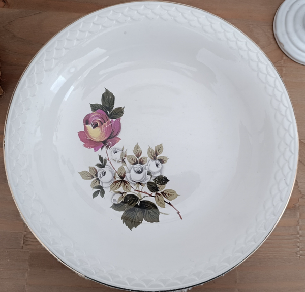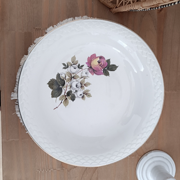 Plat rond creux, Digoin & Sarregumines aux motifs floraux et bords en écaille & doré.